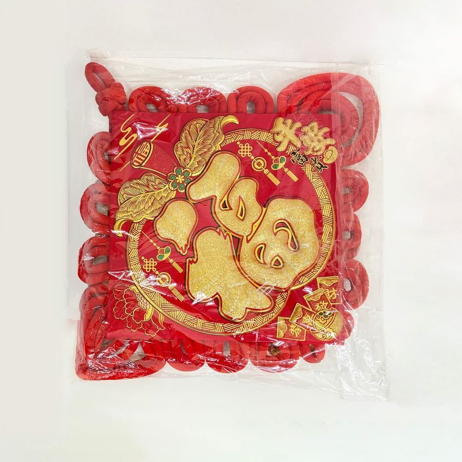 Традиционный китайский узел в форме ромба с символичным дизайном. Яркое сочетание красного бархата и золотых элементов создает эффектный акцент в интерьере.